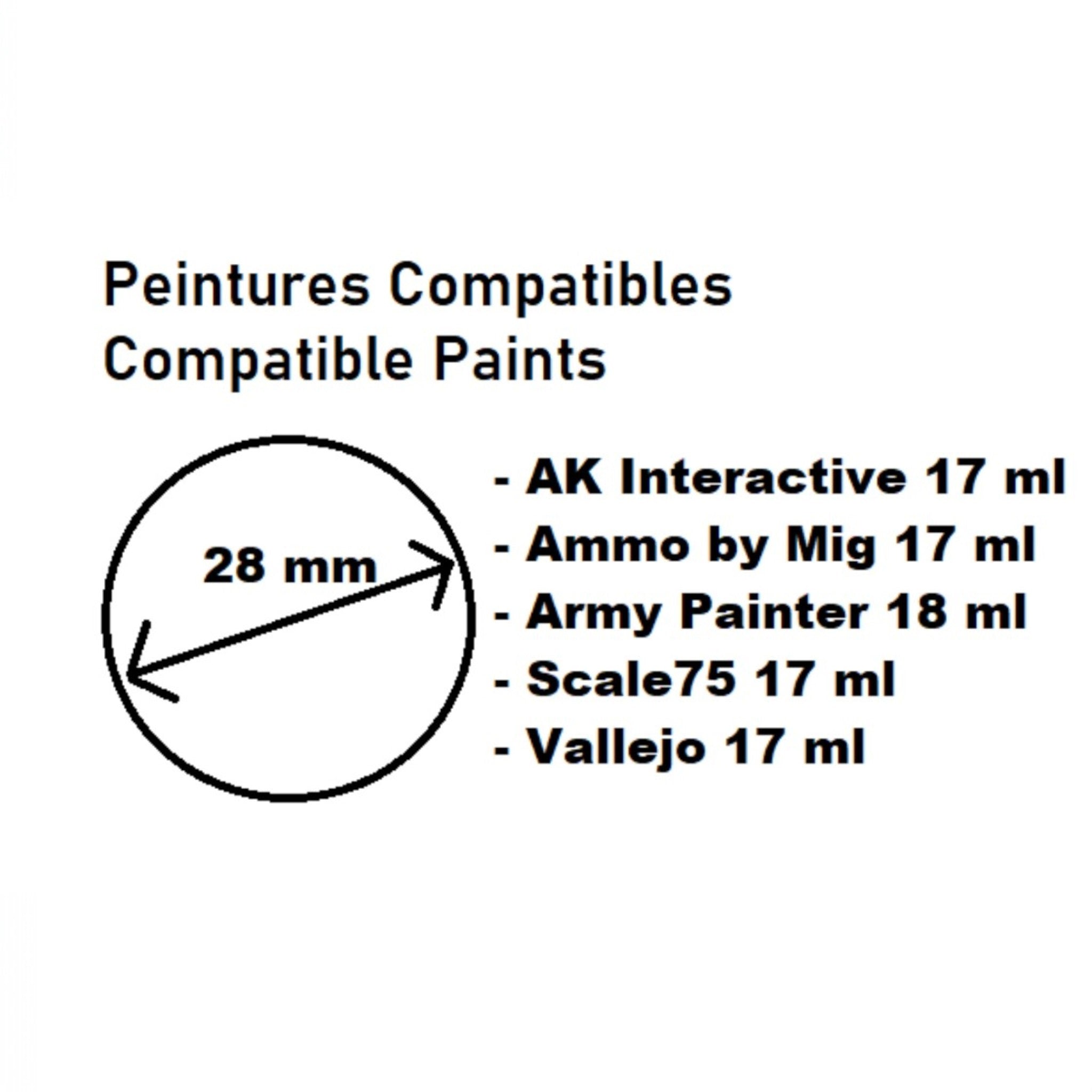 Si vous utilisez d'autres marques de peintures, merci de vérifier leur taille avant de placer une commande. Le diamètre des trous sur ce support est de 2,8 cm.